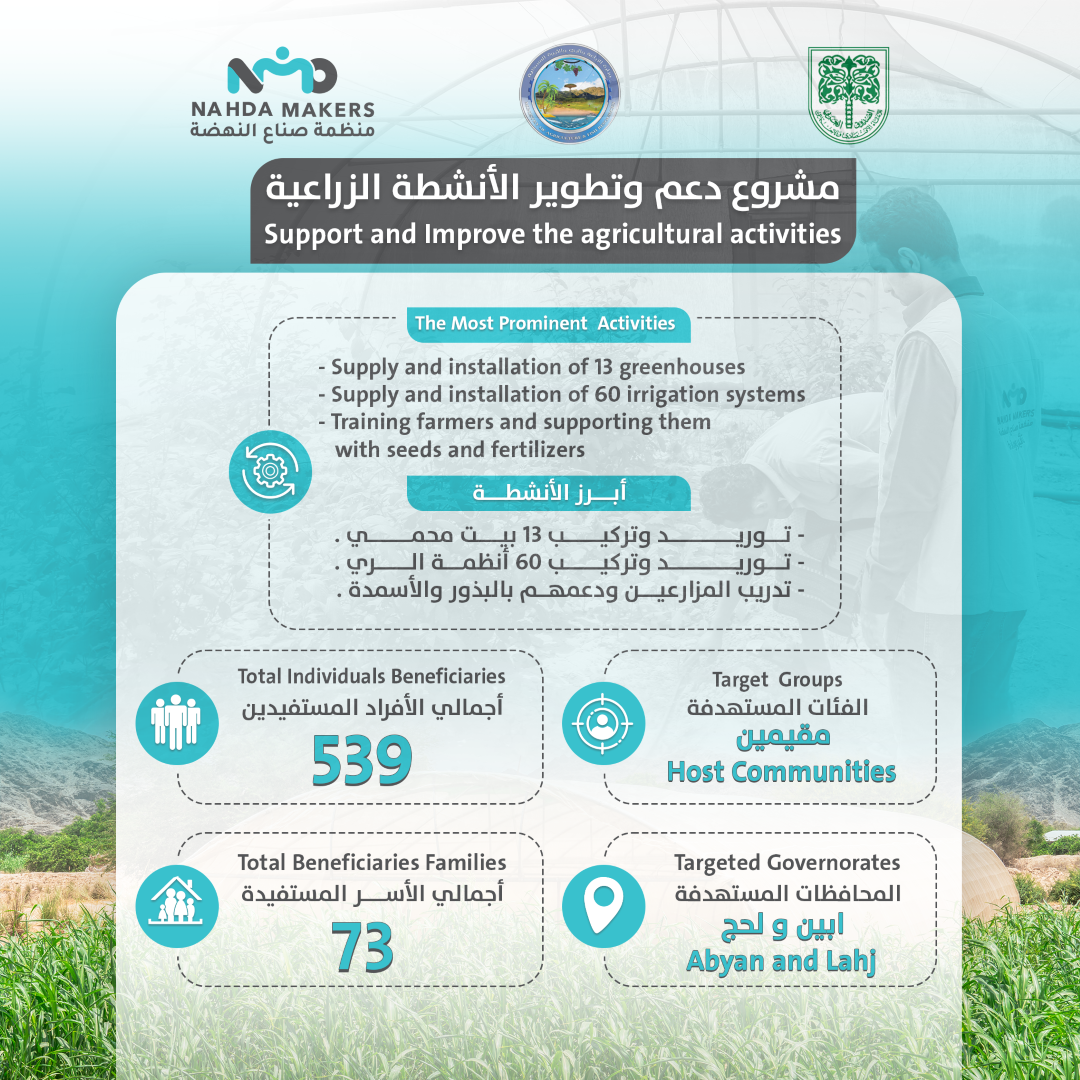 لممارسات الزراعية السليمة تساعد على تحسين مستوى دخل المزارعين وتحقق نتائج زراعية محسنة وسليمة شاهد الإنفوجرافيك والذي يوضح كيف عملت المنظمة بتمويل من #الصندوق_العربي_للإنماء_الاقتصادي_والاجتماعي على أن يستفيد 539 فرد في أبين ولحج على ذلك من خلال توريد وتركيب 13 بيت محمي بالإضافة إلى 60 من أنظمة...