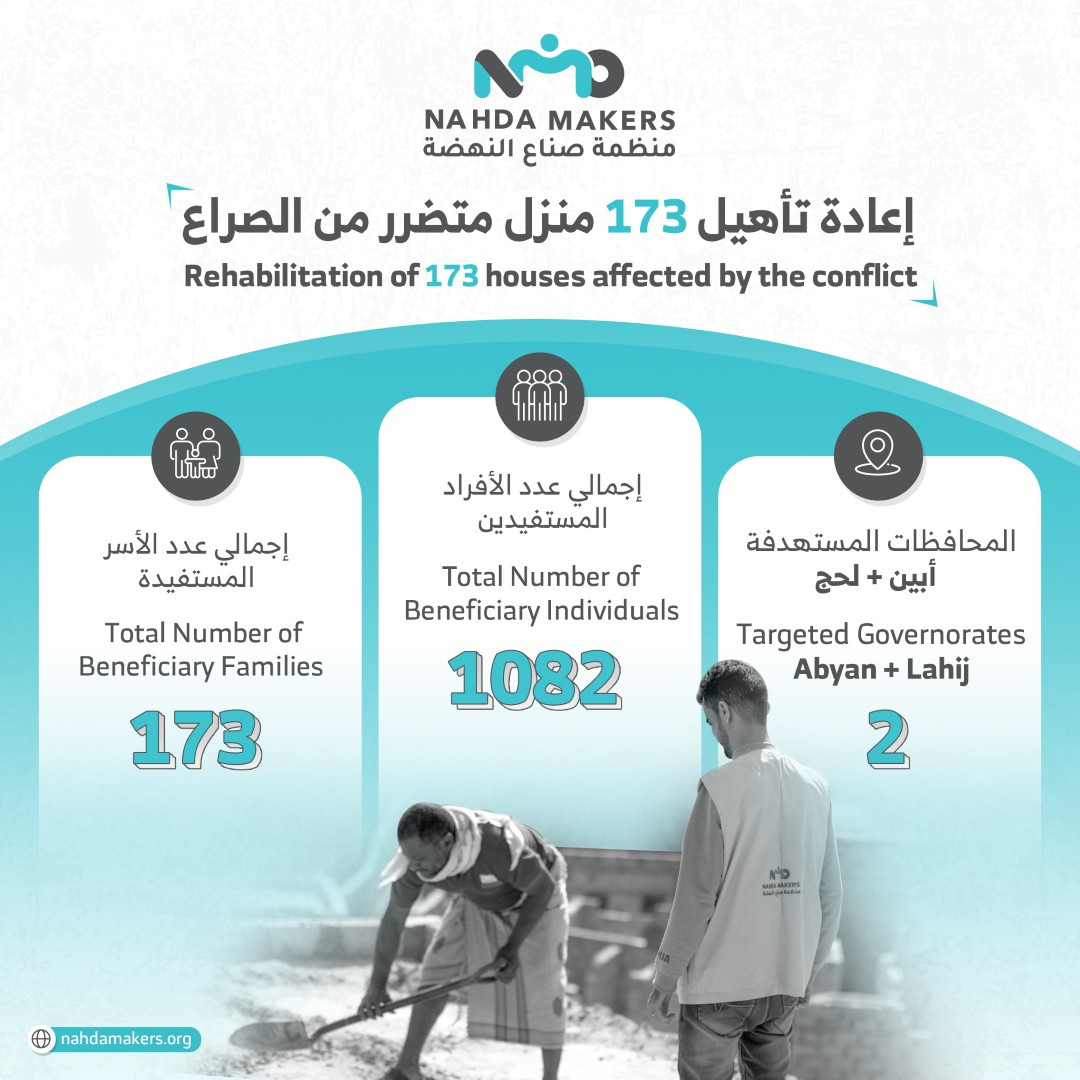 جهود كبيرة بذلت لإعادة الاستقرار للأسر المتضررة من الصراع في #لحج و #أبينفقد عملت منظمة #صناع_النهضة على إعادة تأهيل وترميم 173 منزل متضرر ليعود 1082 فرد إلى منازلهم بأمان بعد تجرع مرارة الصراع والنزوحشكرا لداعمينا والذين كان لهم الدعم السخي في ذلك #YHF #UNHCR