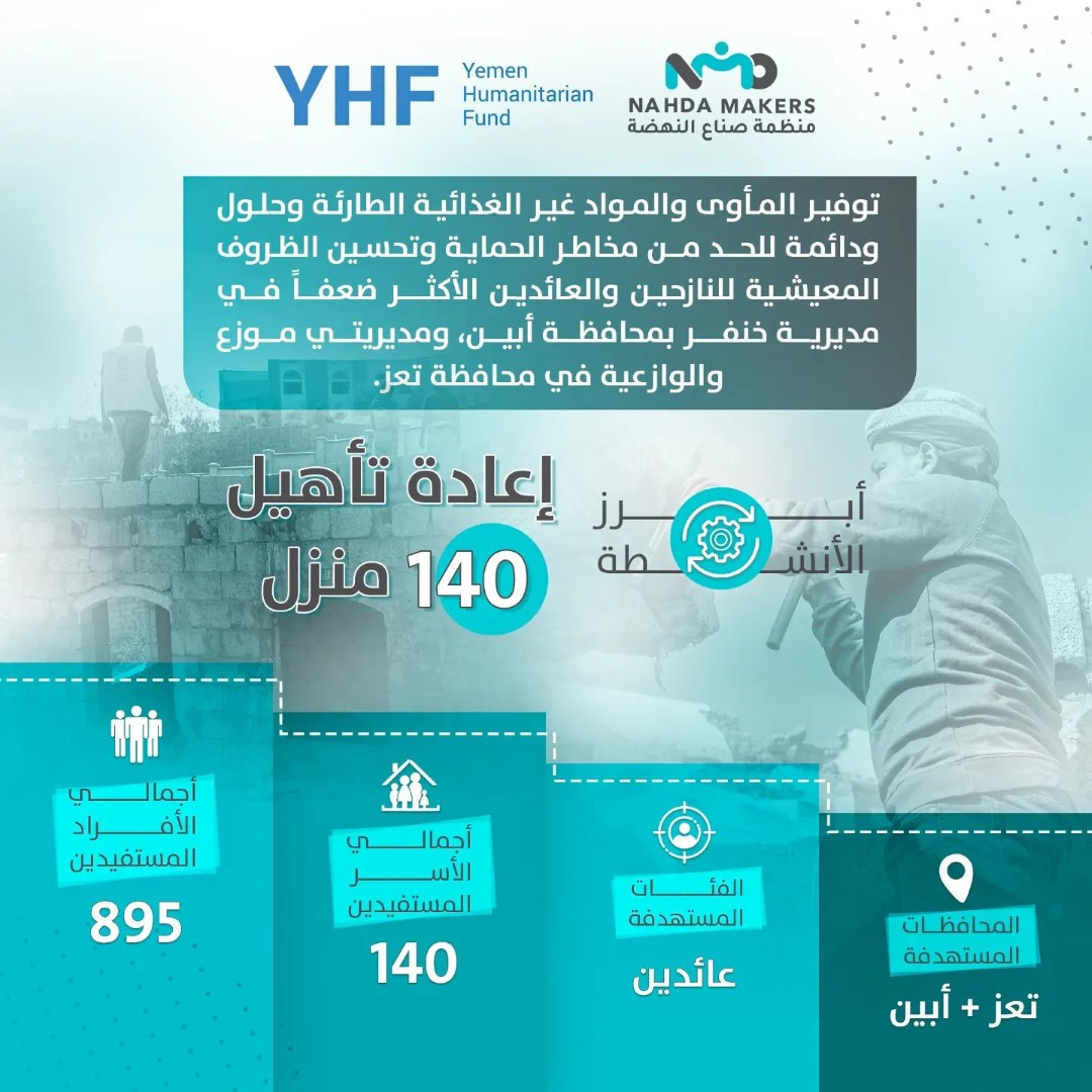 جهود كبيرة بذلت لإعادة الاستقرار للأسر المتضررة من الصراع في #لحج و #أبينفقد عملت منظمة #صناع_النهضة على إعادة تأهيل وترميم 173 منزل متضرر ليعود 1082 فرد إلى منازلهم بأمان بعد تجرع مرارة الصراع والنزوحشكرا لداعمينا والذين كان لهم الدعم السخي في ذلك #YHF #UNHCR