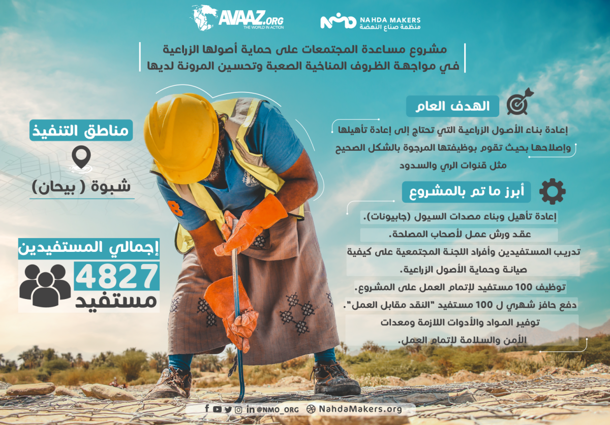 مشروع "مساعدة المجتمعات على حماية أصولها الزراعية في مواجهة الظروف المناخية الصعبة وتحسين المرونة لديها" في محافظة شبوة "بيحان" والذي عمل على بناء قنوات الري والتحويلات والحواجز المائية بحيث تقوم بوظيفتها المرجوة بالشكل الصحيح مثل قنوات الري والسدود لحماية الأصول الزراعية وذلك من خلال (النقد مق...