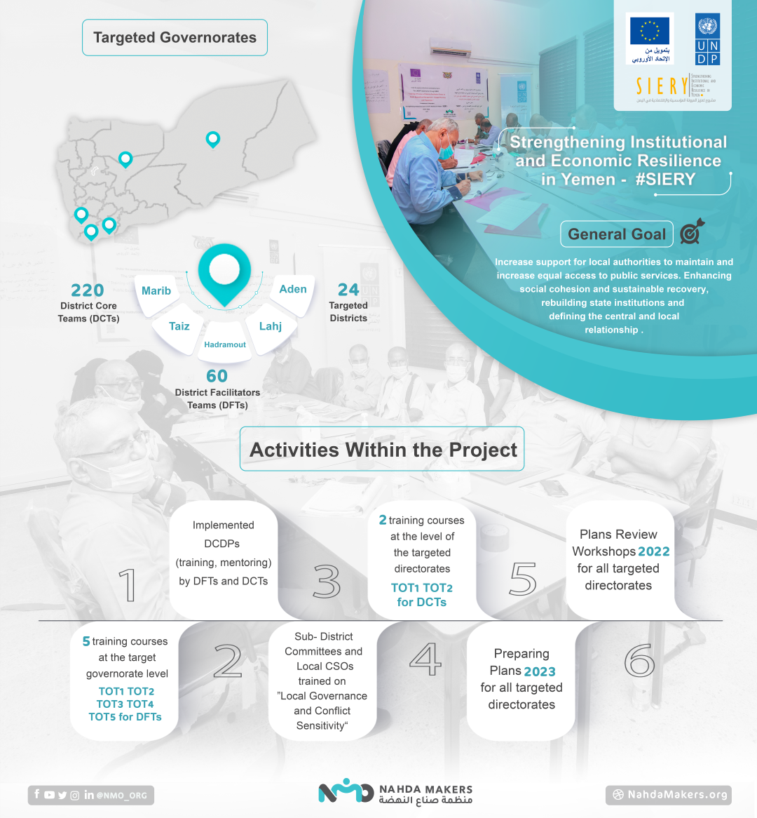 مشروع تعزيز المرونة المؤسسية والاقتصادية في اليمن (SIERY) هو مشروع ممول من قبل الاتحاد الأوروبي (#EU) وبتنفيذ من برنامج الأمم المتحدة الإنمائي ( #UNDP ) عبر منظمة صناع النهضة (NMO) والذي يهدف إلى زيادة الدعم للسلطات المحلية للحفاظ على المساواة في الحصول على الخدمات العامة وزيادتها وتعزيز التما...